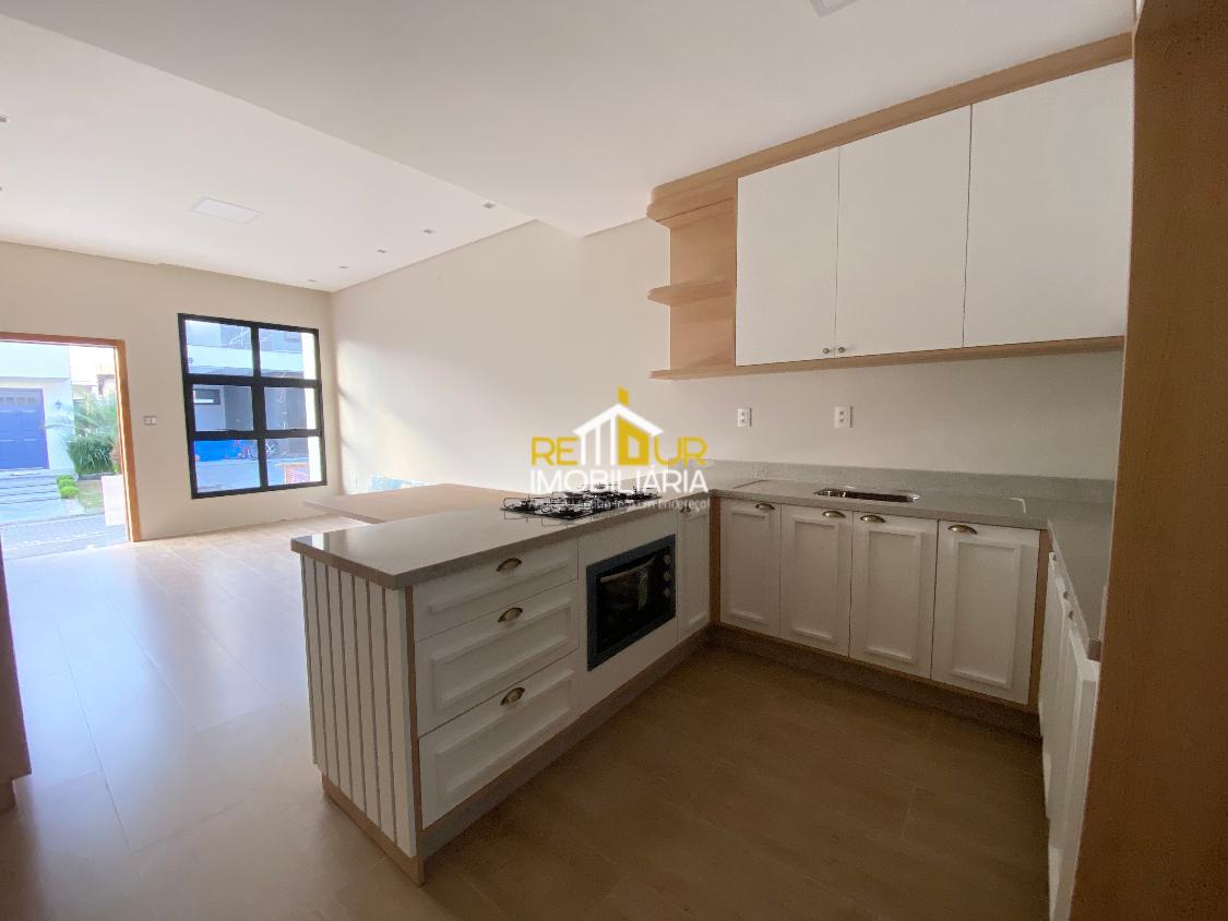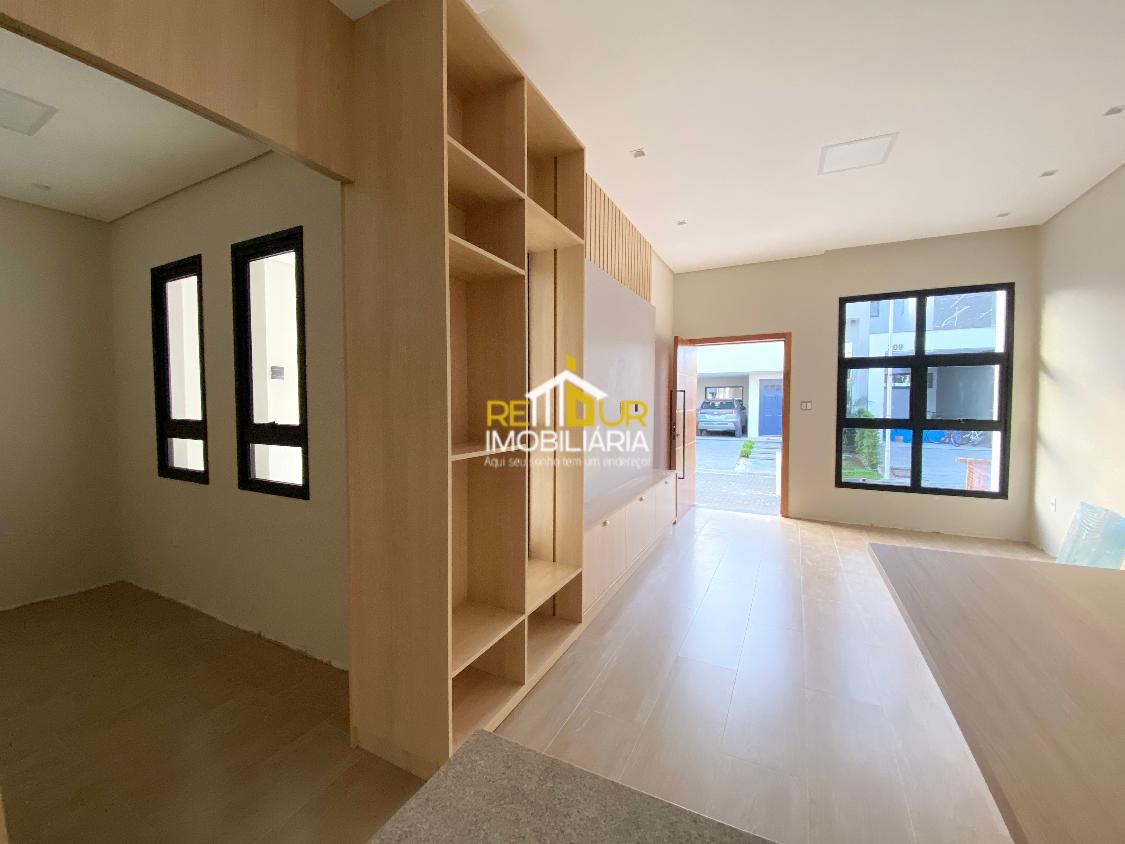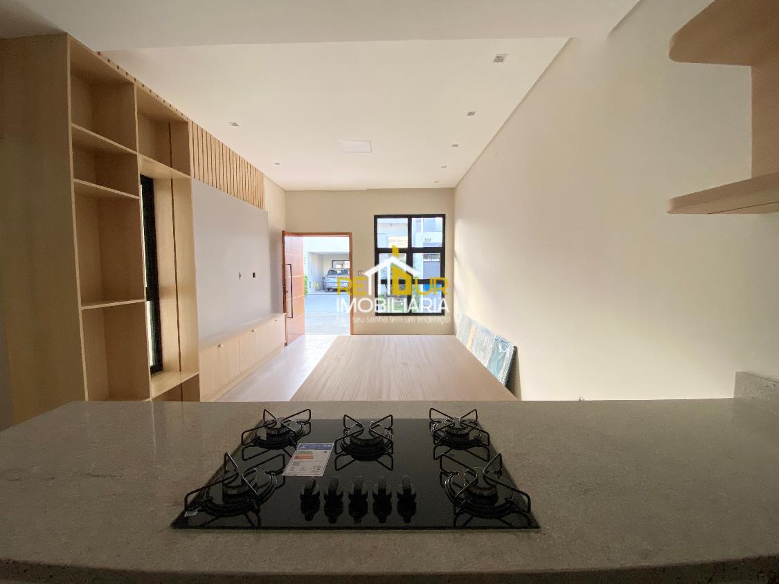 Os móveis contam com mesa embutida para 6 lugares, cozinha com armários, cooktop estilo ilha e pedra, suíte mobiliada com guarda roupa amplo, banheiros com espelho, móveis, Box e pedras, lavanderia ampla com armários, área gourmet interna com churrasqueira a carvão. Conta ainda com piso de porcelanato, persianas embutidas nos quartos, jardim de inverno. Faltam poucos detalhes para concluir a casa, os rodapés serão instadalos e limpeza final será feira para entrega.
